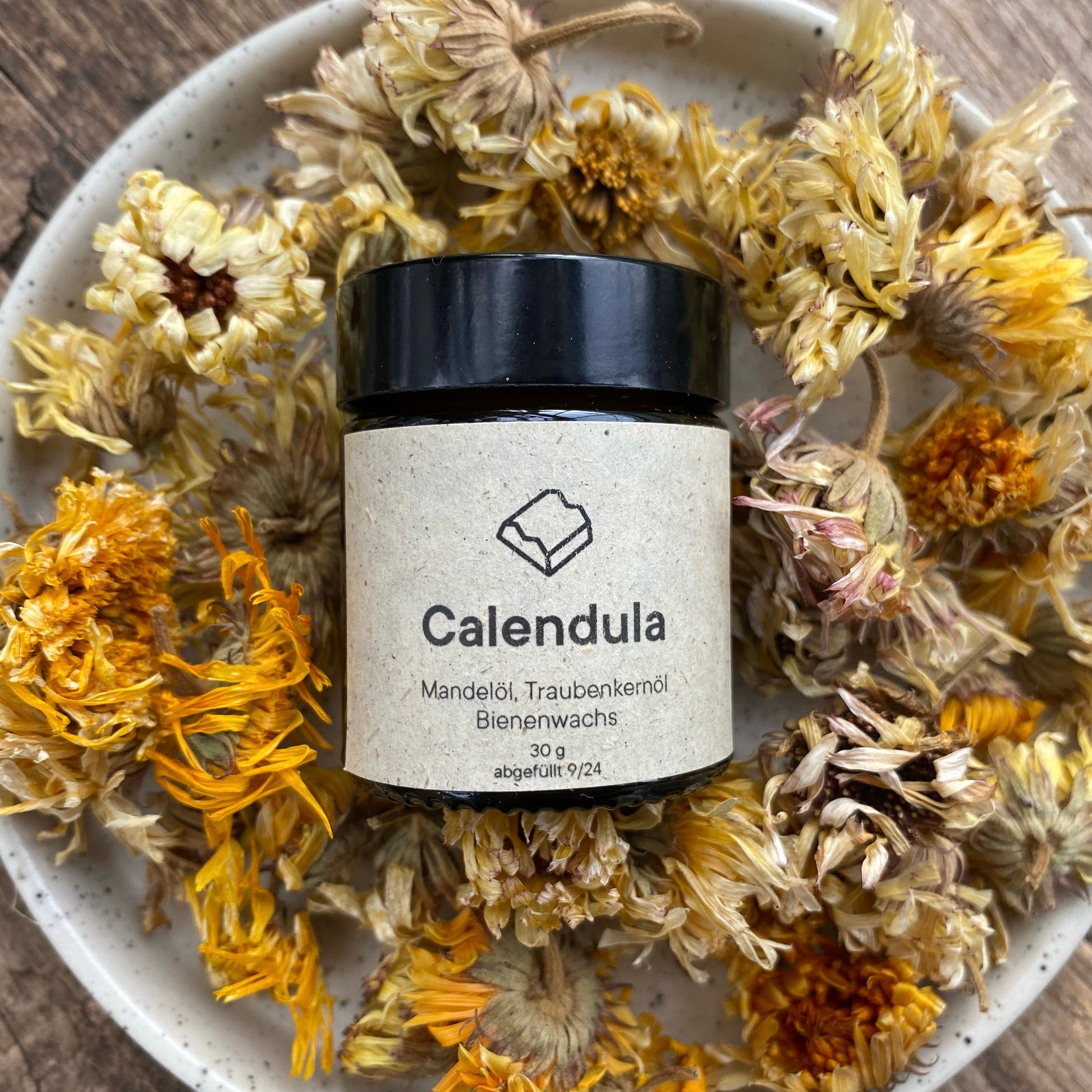 Calendula - Ringelblume - ist die erste und letzte Blume die ihr bei uns im Garten findet werdet, denn sie blüht von Mai bis November ununterbrochen. Dieses Jahr haben wir mit den getrockneten Blüten eine Calendula-Salbe hergestellt. Aus nur drei natürlichen Zutaten: Calendula-Öl auf Basis von Bio-Mandelöl, Bio-Traubenkernöl und Bienenwachs. Sie ist cremig, reichhaltig und ein guter Begleiter für die kalte Jahreszeit, mit vielfältiger Anwendung: als Lippenpflege, Augen- oder Handcreme, sowie als Wundsalbe.