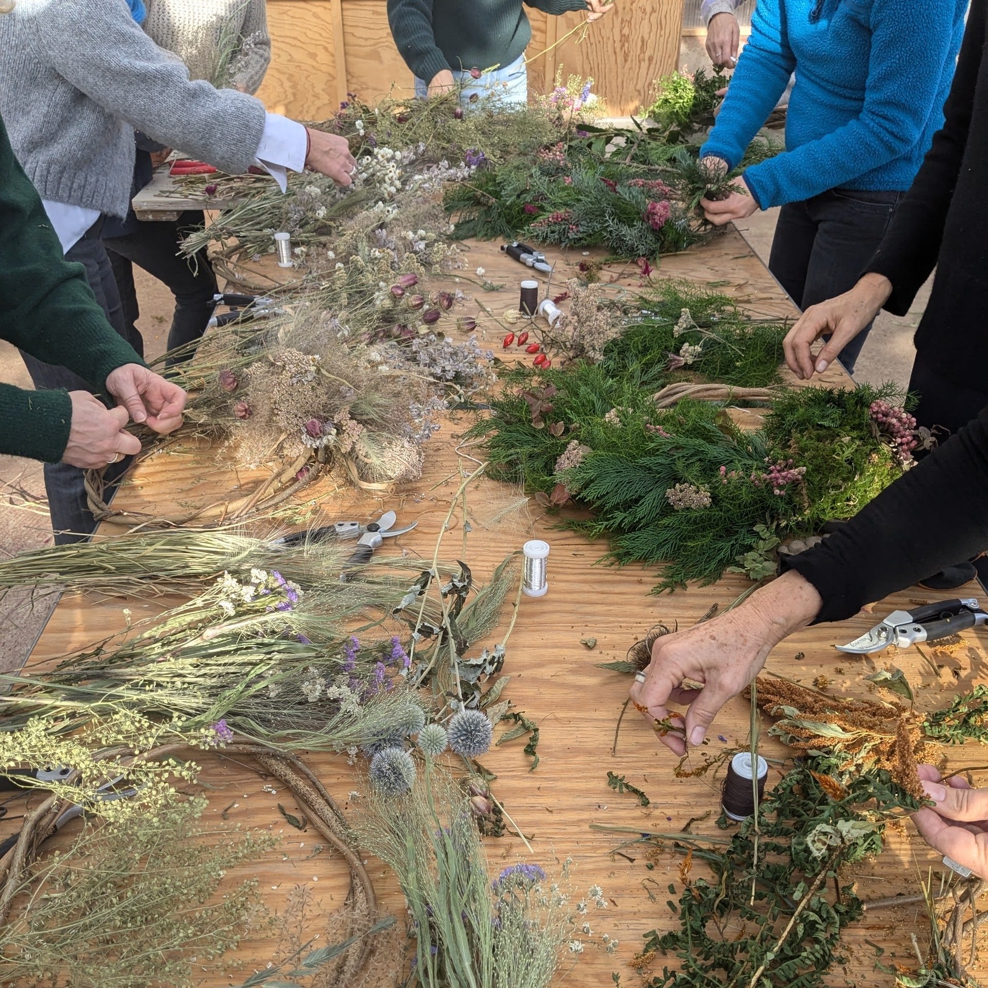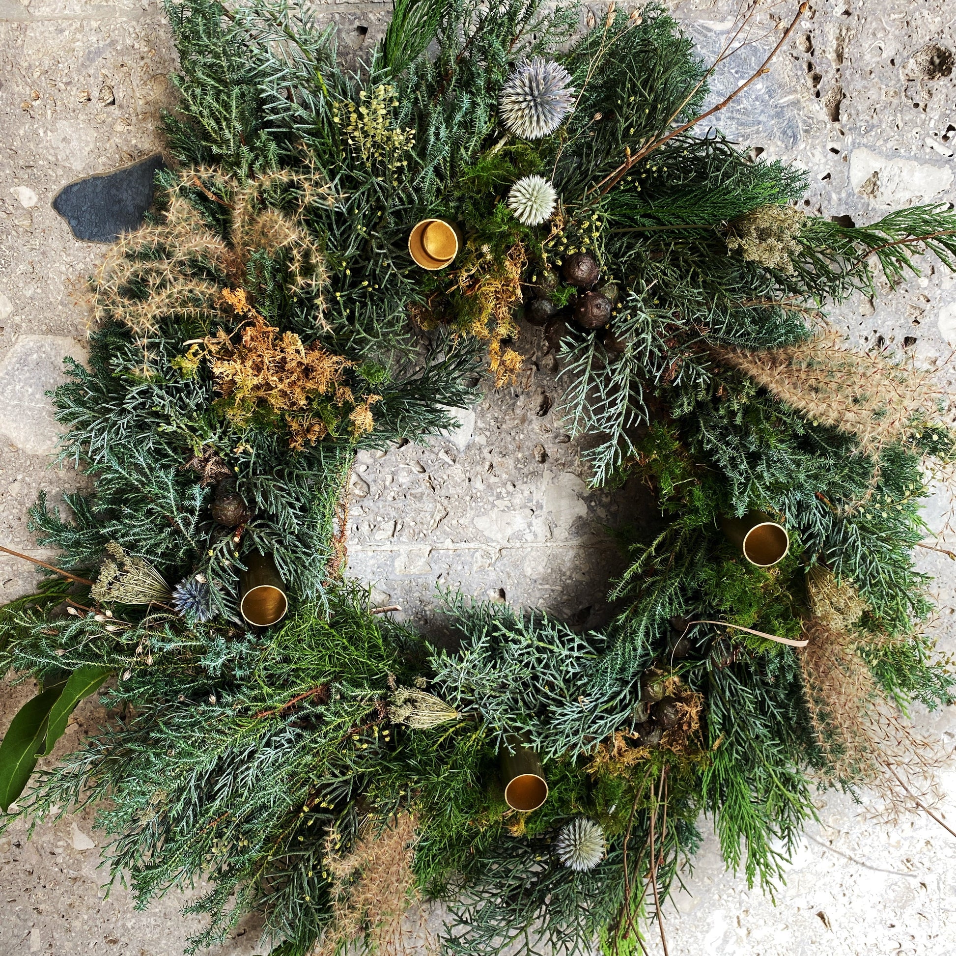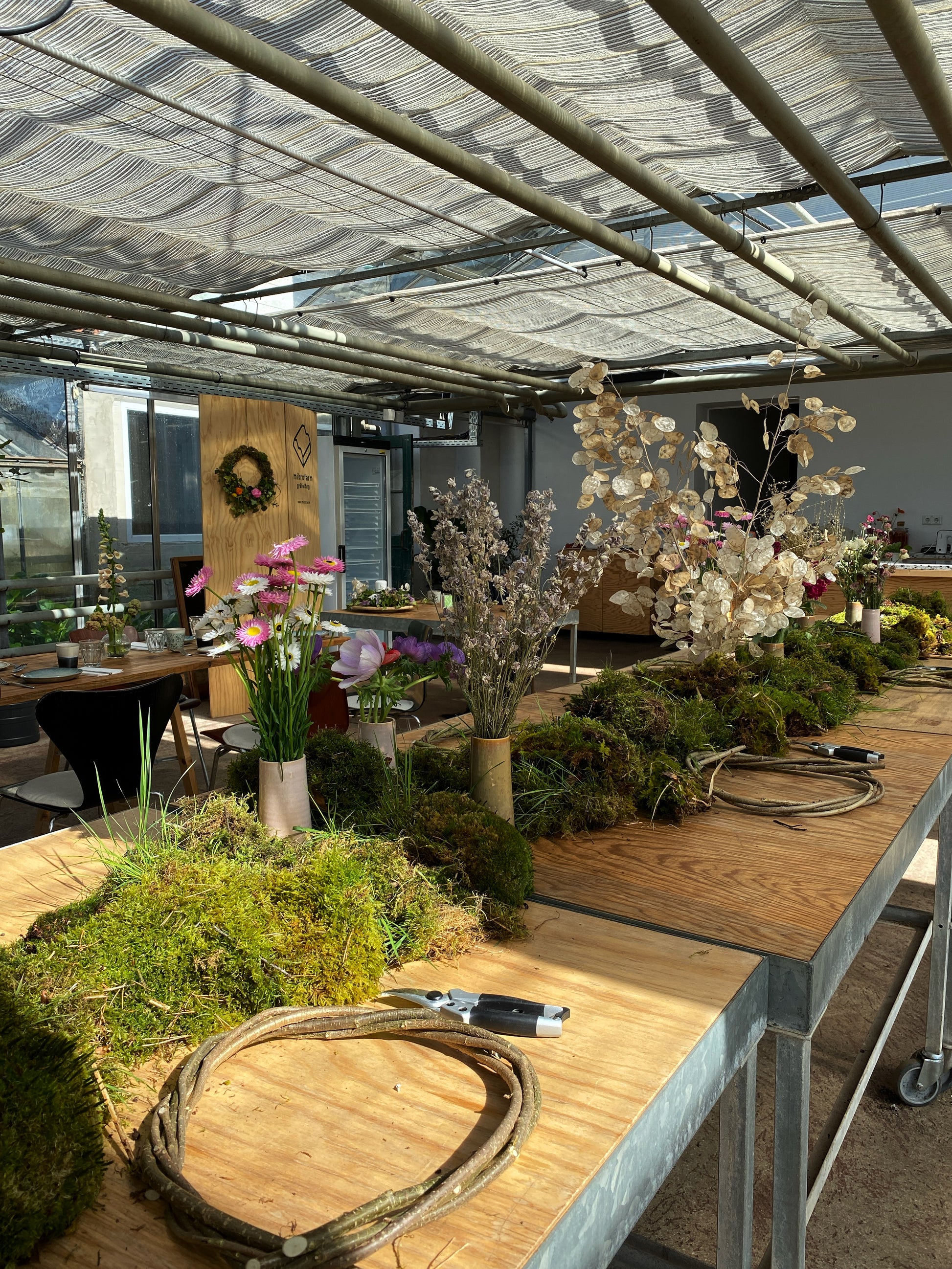 An unserer Blumen-Bar wählt ihr eure Lieblingsfarben und -strukturen – wild und natürlich oder zart und fein. Mit meiner Unterstützung bindet ihr daraus euren ganz persönlichen Kranz aus Tannengrün, Trockenblumen und vielen kleinen Schätzen aus dem Garten.